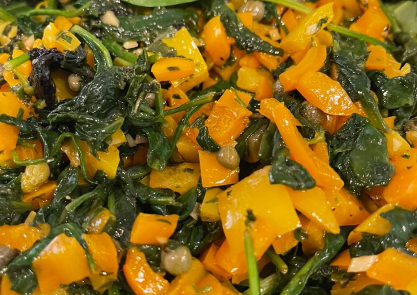 - En una sartén pon aceite de oliva y agrega el ajo a sofreÃr por 1 min a fuego bajo, agrega los pimientos y cocina por 4 min y luego agrega las espinacas a freÃr por 2 min y agrega el vinagre balsámico, azúcar, sal y pimienta al gusto