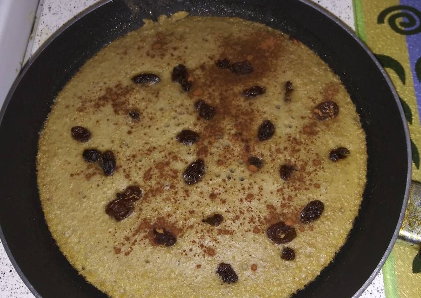 - Agregar la avena y licuarlo. Luego engrasar el molde y verter en el molde. Agregar canela y pasas al gusto.