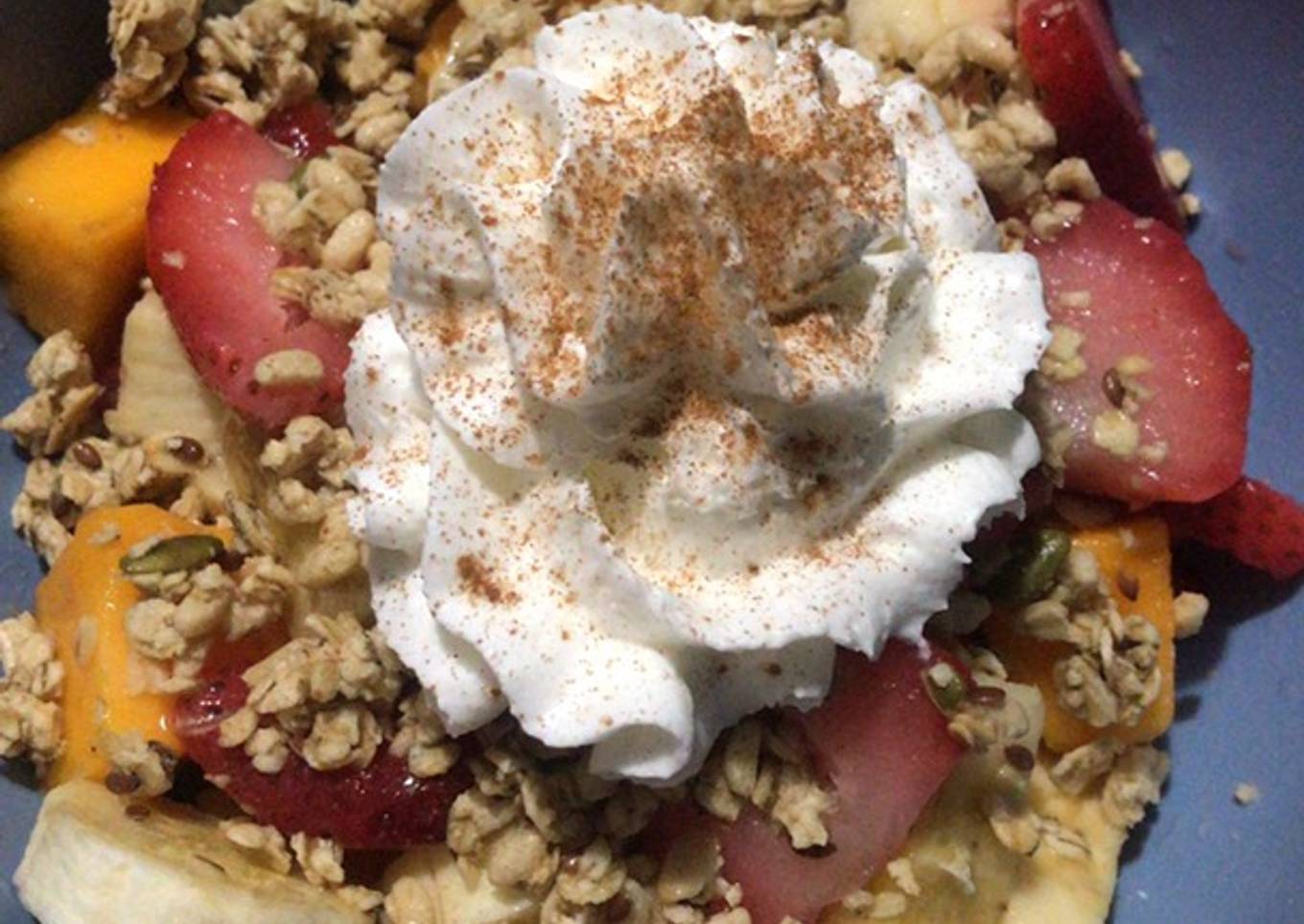 - Trozar las frutas escogidas, mezclarlas en un envase, puede usar granola (como es en el caso de foto) o puede usar almendras, nueces (para añadir la grasa natural). En vez de whip cream, puede usar yogurt y si es griego le añade proteínas.