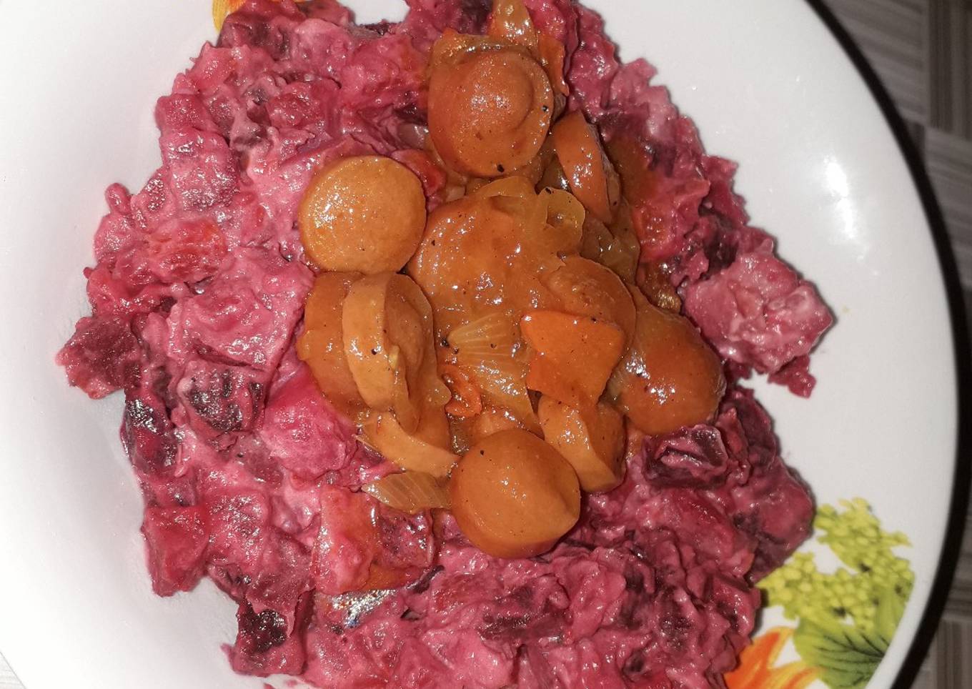 Steps to make to make Ensalada de papas con remolacha con salchicha guisada