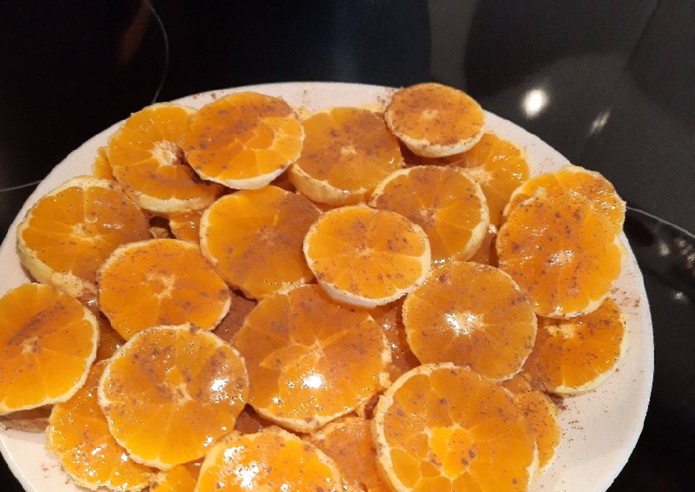 - Las ponemos el plato que vayamos a presentar y ponemos capa de naranjas miel y canela