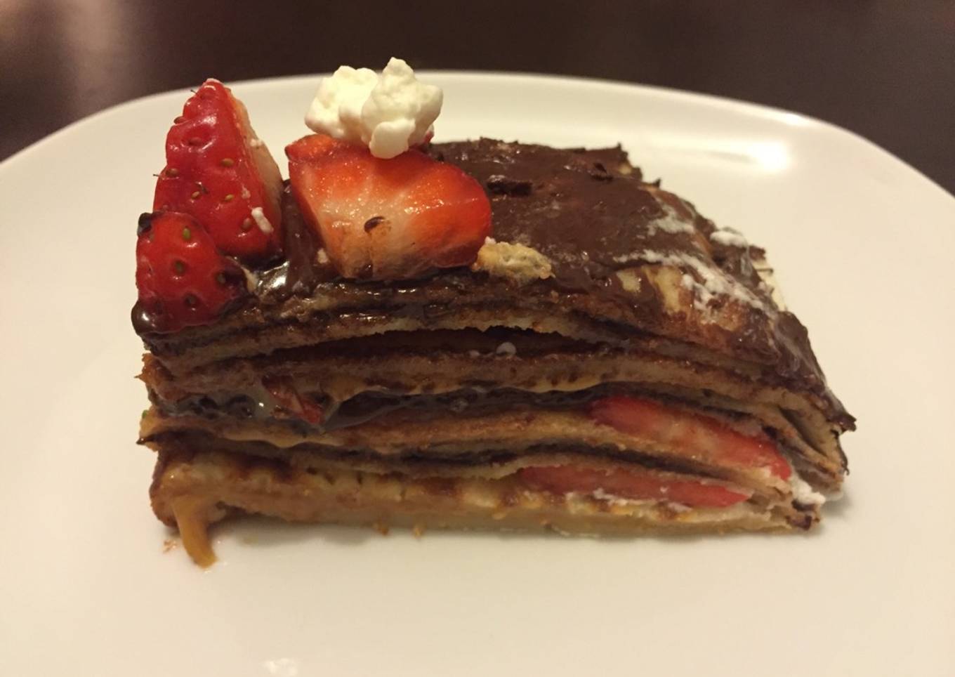 Vamos haciendo capas de crepes con los rellenos primero el dulce de leche, segundo la nata montada con las fresas en rodajas, tercero la capa de chocolate y repetimos hasta la última capa de chocolate cubierto con fresas troceadas