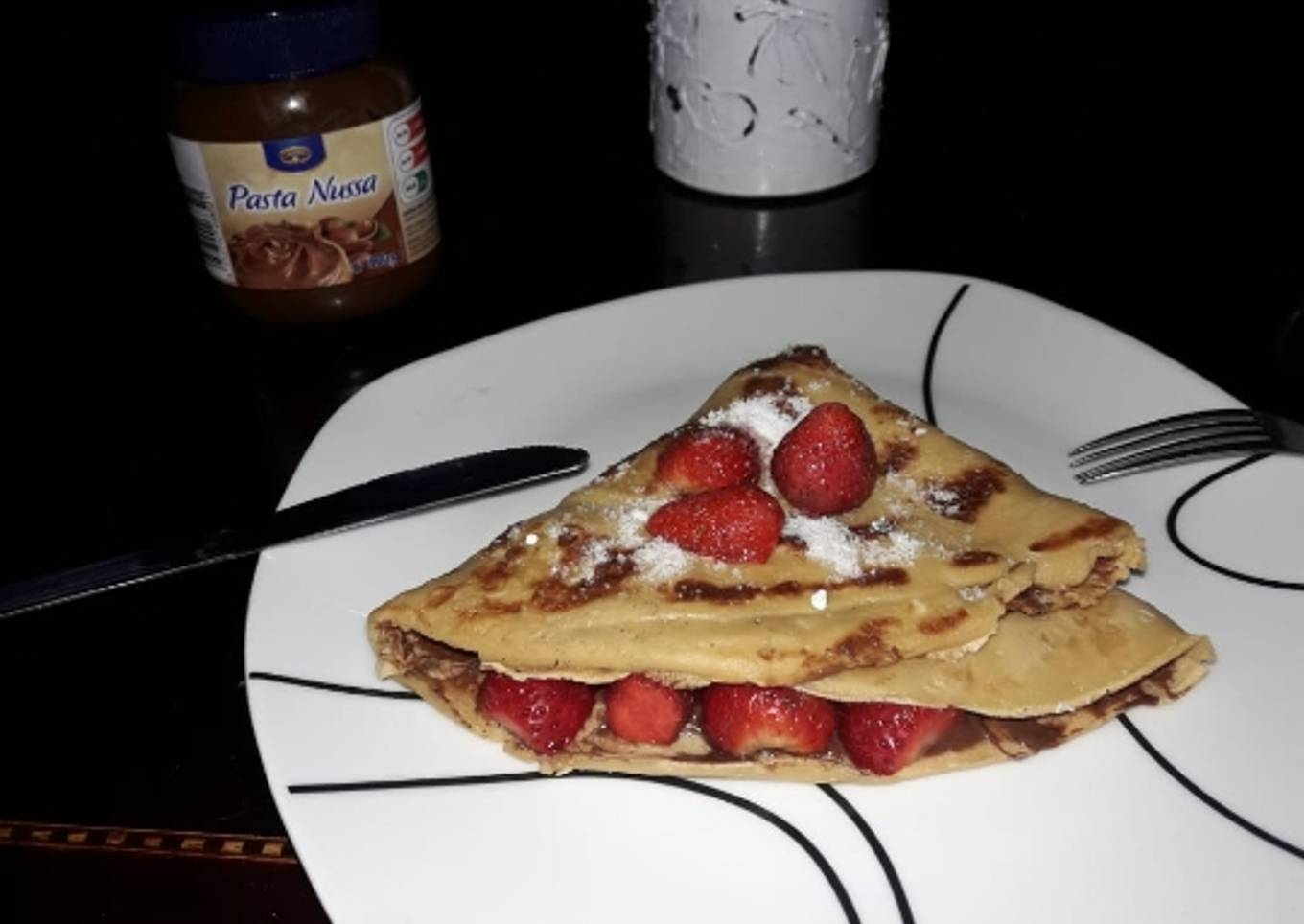 - Ahora es momento de decorarlo, primero tienes que cortar las frutillas a la mitad, y tener ya lista tu azúcar glass, si no tienes, sólo pon azúcar a la licuadora y ahí lo sacas, y ahora en el pancake le ponemos la Nutella o cualquier chocolate derretido y lo esparcimos, y le pones frutillas y lo cierras en forma de triángulo y por encima le puedes poner azúcar glass con frutilla o Nutella o crema batida, eso queda a tu gusto y LISTOO