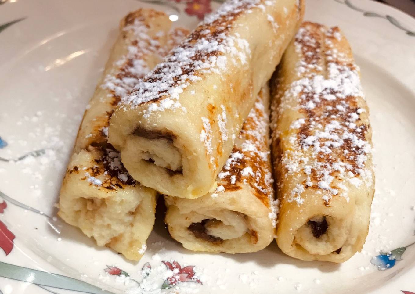 - Aplastamos bien las rebanadas de pan y las untamos con nutella o nocilla (lo que más os guste). A continuación lo hacemos un turulillo enrollando el pan.